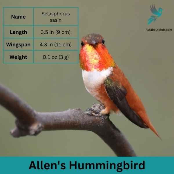 | Feature | Measurement | | | Scientific Name | Selasphorus sasin | | | Length | 3.5 in (9 cm) | | | Wingspan | 4.3 in (11 cm) | | | Weight | 0.1 oz (3 g) | |